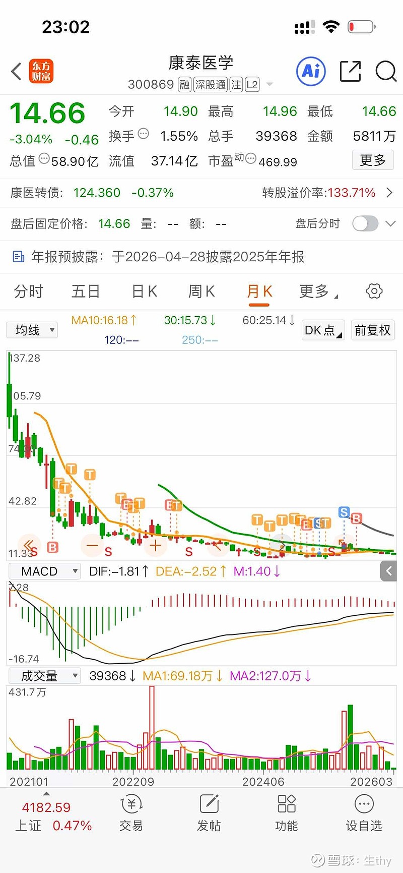 $康泰医学(SZ300869)$ 明天继续跌的话,我就要加仓了,给机会吗?前段时间以为能启动了,结果量能还是上不去,明显套牢的留下的人像我一样摆烂了,这些年跟着它,看着一路减持,却还在坚持,为了什么?一来,还在每年分红,很少但也是分红!二来老人所坚持的横走多长竖有多高!三来我个人看不到退市的风险,老人有一个经验,只要不退市,总会有山峰出现,万物皆有周期!四来所看到的股东数量一直维持比较稳定,估计都说被套住的老人了,这部分人按常规的快速涨20%,再阴跌折磨收筹码的效果不会很好,吓不到,这么多年来,一直减持都不怕,怕这点小波动?好了,再跌就真的会加仓的,定投就挺好。加油!目标是两三估计才能让追随的老人还筹码给你。![]()