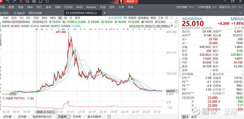 $Moderna(MRNA)$ 现在moderna股价和新冠疫情前一个价格。但是那时候什么产品都没有,而现在有被新冠证明有效的mrna技术,有几个产品:新冠疫苗(常温保存),rsv疫苗,三期临床数据很好正在申请的流感疫苗,还有做完三期等待监管审批指引以再度递交审批的新冠+流感组合疫苗(加拿大没有政策混乱,已申请,会早于美国本土上市),针对黑色素瘤的个体化癌症大概26年末三期临床关键数据公布,顺利的话27年上市,年底还有近70亿净现金。这些变化是巨大的,但是前复权股价却没有变化。moderna现在据说是标普500里最被做空的股票,我怀疑市场的判断。即便不符合能力圈的标准,我也认为是一个标准的价值投资。我认为很可能是市场错了,即便我错了,我也错的不离谱。在科学和实验结果面前,谁都不敢说自己一定对。万一moderna的癌症疫苗表现不错(明年先公布的是临床二期的五年数据),加上流感疫苗顺利上市,那么出现空头回补的阶段性暴涨也有可能,至少一轮估值修复。没有绝对确定的事情,这是个概率,我认为是划算的,但也因人而异。