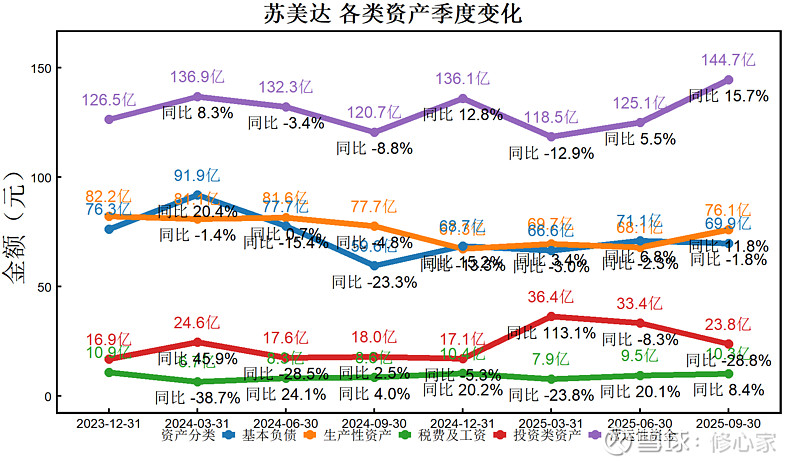 家庭投资股票、债券、比特币、黄金,用的是资金换收益的逻辑。企业的对应项是交易性金融资产、衍生金融资产、债券投资、其他金融资产、其他权益工具投资、长期股权投资等。它们能创造财富,但并非企业主营业务的一部分。对成熟企业来说,如果主业扩张空间有限,把钱放在这类资产中未尝不可,但持有过多也意味着本该分给股东、让股东自己去投资的利润,被企业留在了账上。