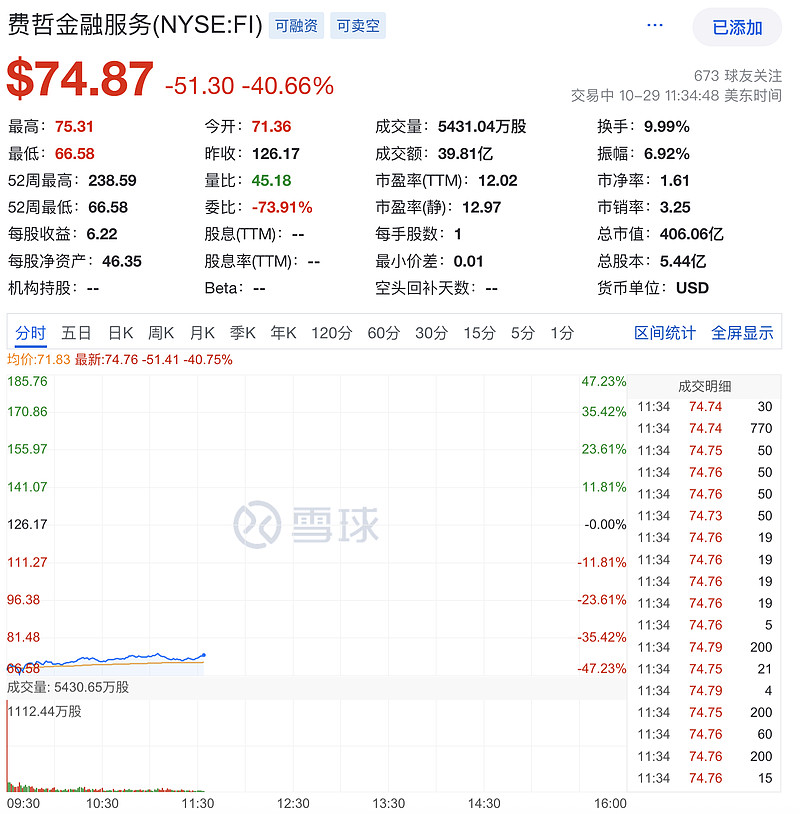 $费哲金融服务(FI)$ mark一下,第一次买到爆雷股,单日跌去40%+,联想到之前中概暴跌的黑色时代,记录一下。