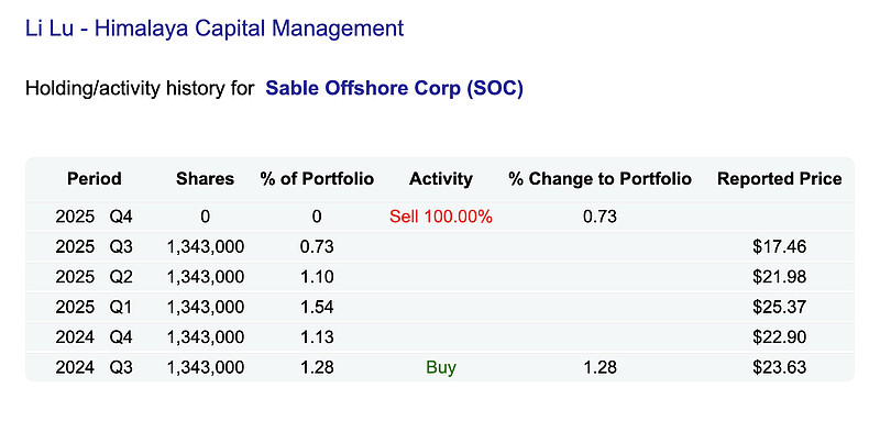 $Sable Offshore(SOC)$ 偶尔关注到这个票是在Li Lu的持仓里面,最近几年基本面恶化股价一路下跌,很好奇他会如何处理,记得他的访谈里面提到如果连续几年不能承受50%以上的回撤,就不能算是真的懂价值投资。