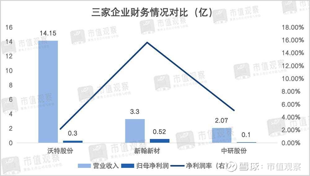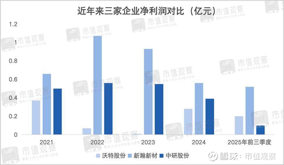 从财务对比来看,2025年前三季度沃特股份的收入规模最高但盈利能力较低,实现归母净利润0.3亿,净利润率仅2.14%,而中研股份和新瀚新材的净利润率分别为5.04%和15.62%。