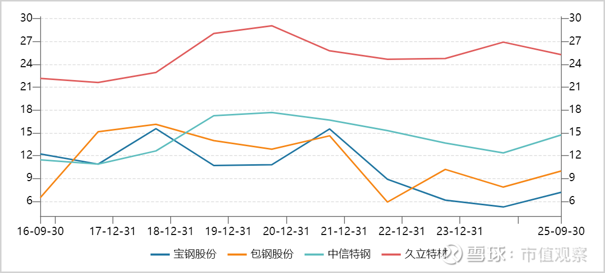 2021年三季度到2025年三季度,宝钢股份、包钢股份的营收年复合增速均为个位数负值,净利润增速更是大幅下滑(宝钢-22%,包钢-50%),包钢还出现过两年亏损。