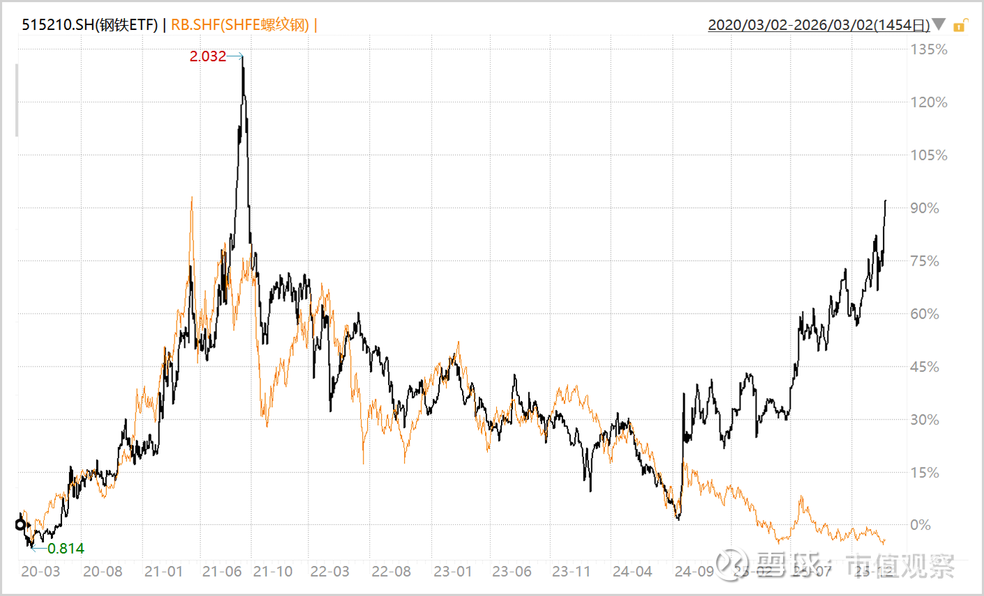 过去多年,A股钢铁板块与螺纹钢价格走势高度同频。但从2024年9月开始,两者却罕见地分道扬镳——钢铁板块一路高歌,累计涨幅超过80%,一举回到2021年10月的高位水平。而螺纹钢价格却仍在3000元/吨附近徘徊,处于近十年来的底部区域。