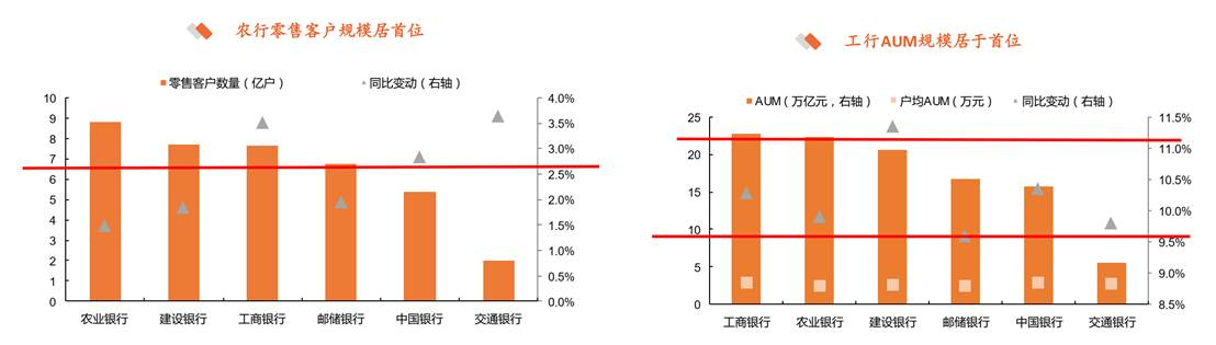客户方面,农行零售客户数量最多,而零售AUM则由工行继续领跑。