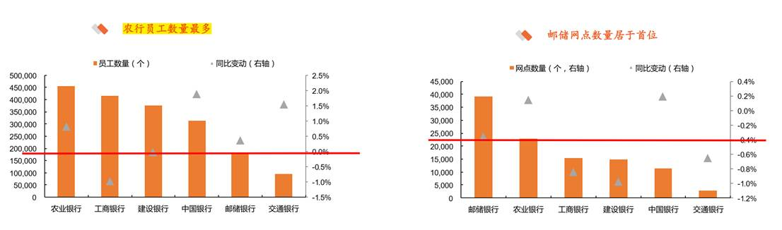 【营收结构:农行对公零售逆势上行,邮储对公贡献显著提升】其中农业银行零售、对公收入逆势上行。邮储银行侧重推动对公业务改善,对公营收同比迅速上行。建行、邮储零售业务占比较高,交行、工行以对公收入为主。(注:分部收入,个人银行业务占比,邮储=70%,农业=从42%提升至55%,建行=50%。从收入比例上看,邮储是绝对的个人零售业务为主,农行的个人业务收入占比提升显著,建行显得更加均衡。)(注:邮储银行的户均aum最低,农行倒数第二,基数低导致稍微改善,就能提高户均aum。)农行员工数量居同业首位,通过增加服务人员数量来更好服务广大县域地区。(注:农行的人均创收8.3万元/人,邮储=176 万元/人,招行=288万,建行=199万,宁波=247万。很明显,农行是通过人海战术来进行规模扩张的,长期看劳动人成本是无限增长的,这玩法搞不好就运营成本失控?)