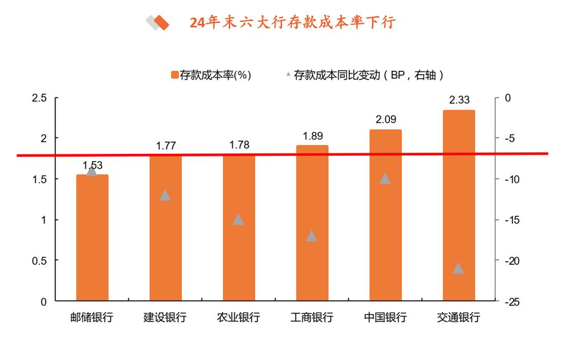 从存款付息率来看, 2024年随着存款挂牌利率的调降,大行存款成本率同步下行。Ø 个体中交通银行同比降幅最大,居大行首位,从绝对水平看,邮储银行维持存款成本的相对优势,虽然同比降幅较小,但仍保持同业存款成本最优。(注:邮储董事长认为:拥有广泛的触达渠道和雄厚的资金实力。实际上已经形成了资本损耗低,资金成本低,信用成本低的三低优势。横向比较:有些道理啊?)