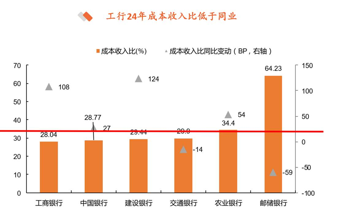 从费用支出来看,各家大行在2024年持续加大对于成本的管控力度,业务及管理费维持低增速,但由于收入端降幅更大,除邮储、交行外,四大行的成本收入比呈上升趋势。从绝对水平看,工行(28%)成本收入比为可比最低。(注:农行的成本管控就是普通水平。邮储的成本收入比高达64%,还是代理费用支出是绝对大头,这就导致其必须是个低利润率的更民生属性的银行。在市场利率上行区间,存贷业务+金融投资业务将赚很多利润,但可以通过代理费进行调剂利润,不可能有高增长。)