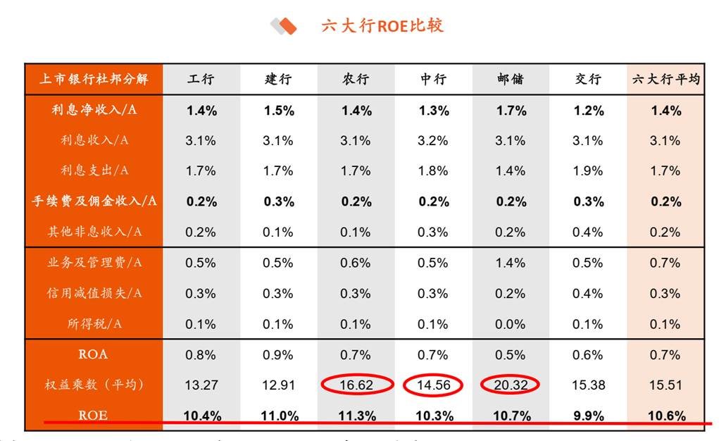 3)建行(0.9%)ROA领跑大行,农行ROE(11.3%)在更高杠杆率的支撑下表现更优。农行roe领先的原因是:利润增速与高杠杆率。而邮储银行的roe仅高于工行/中行/交行,并未显示其与众不同,这与邮储的差异化经营和高杠杆率并不匹配,未来的邮储是否能创造超过行业均值的roe?存疑。