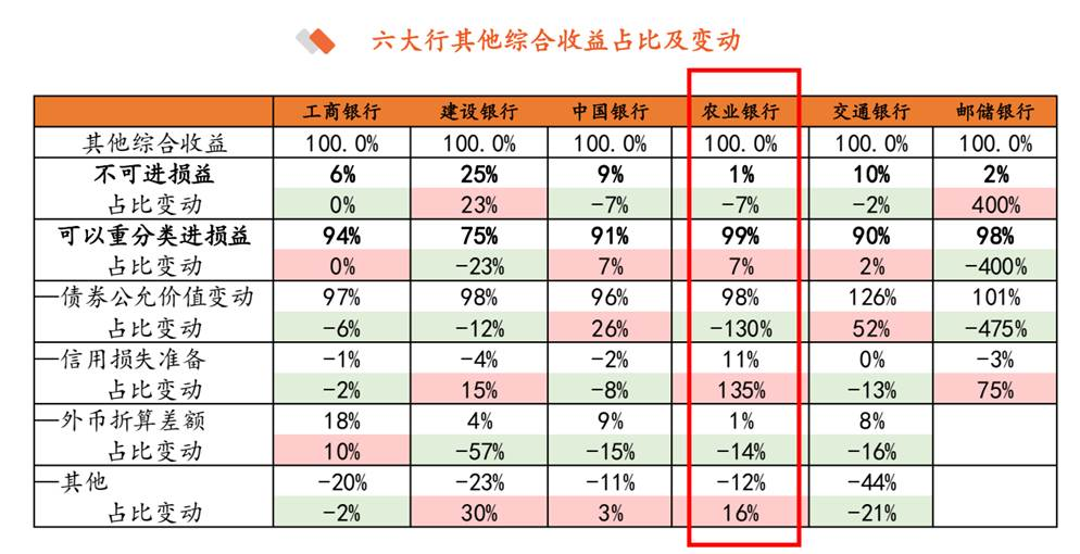 进一步拆分非息收入,能够看到大行投资收益相关的科目整体保持较好增长。Ø 除了非息收入外,通过报表能够看到2024年大行其他综合收益明显上行,考虑到其中能够重分类资产的占比较高,这也对未来稳定净利润增长起到平滑作用。