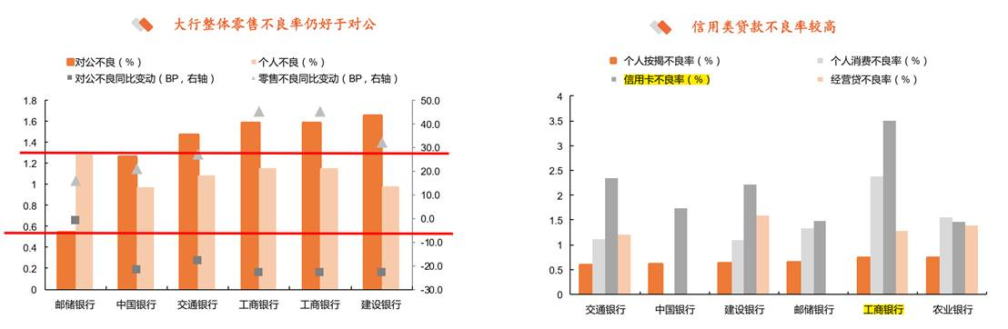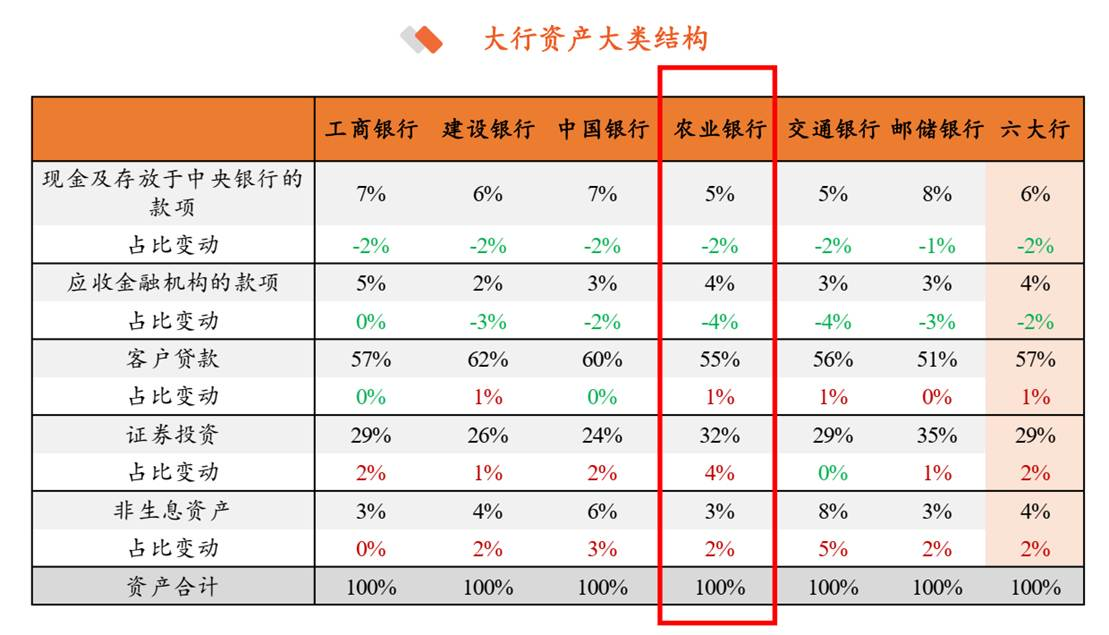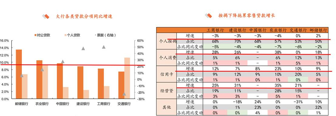 【大类资产:贷款和债券投资占比提升,存款增长弱于贷款】配置结构上向信贷资产和证券投资类资产倾斜,值得注意的是,除邮储银行外,其他大行的存款增速均不及贷款增速。个体上,工行总资产增速(9%)高于其他大行,农行的信贷投放增速(10%)快于其他银行。(农行、交行)通过加大对于非房类个贷的投放来弥补按揭的不足,推动零售贷款增速处于对标行领先水平。(注:结合农行的贷款收益率=3.41%,倒数第二位,而增速快于其他银行,就是挺典型的以价换量,特别是在信用卡+经营贷。邮储银行在贷款上挺克制:其他大行的存款增速均不及贷款增速。)(注:总体规模,邮储总贷款占比51%,依然是行业最低,比较行业平均水平6成左右,还有10个点的增量。个贷按揭:只有邮储是正增长。农行在个人消费/信用卡/经营贷的增速是38%/23%35%,这也太快了,典型的垒规模方式,搞不好就是一地坏账。)