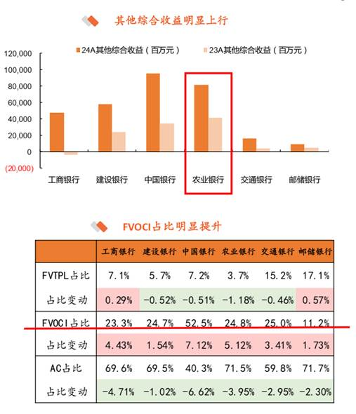 【证券投资: OCI账户下债券配置力度加大】拆分金融投资的三个科目来看, 24年大行FVOCI占比明显提升,其中以中行提升幅度最高。Ø 综合看银行投资债券品种,政府债投资明显增加,也一定程度上与24年政府债发行节奏相吻合。Ø 2024年大行所有者权益项下其他综合收益明显上行,主要受到债券投资力度增加影响。(注:以公允价值计量且变动计入其他综合收益的金融资产”, FVOCI账户,邮储银行的OCI账户占比只有11%,显著低于行业均值,是什么原因?而农行oci账户的配置增长迅猛。)