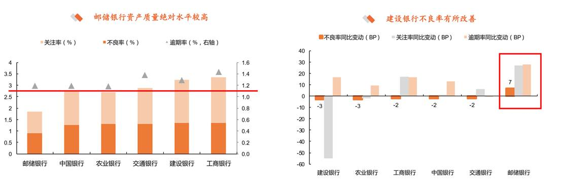 【资产质量:整体稳健,关注零售波动】 除邮储银行外,其他大行不良率均延续下行趋势,从绝对水平来看,邮储银行虽然不良关注率有小幅提升,但绝对水平仍位于同业领先,资产质量指标好于同业。(注:农行并未表现出差异化的风险控制水平?邮储银行的不良上行,与其资产中,零售贷款,特别是2小类贷款占比高有关。反过来,如果邮储的2小类贷款的坏账失控的话,基本上就距离技术性破产不远了。)