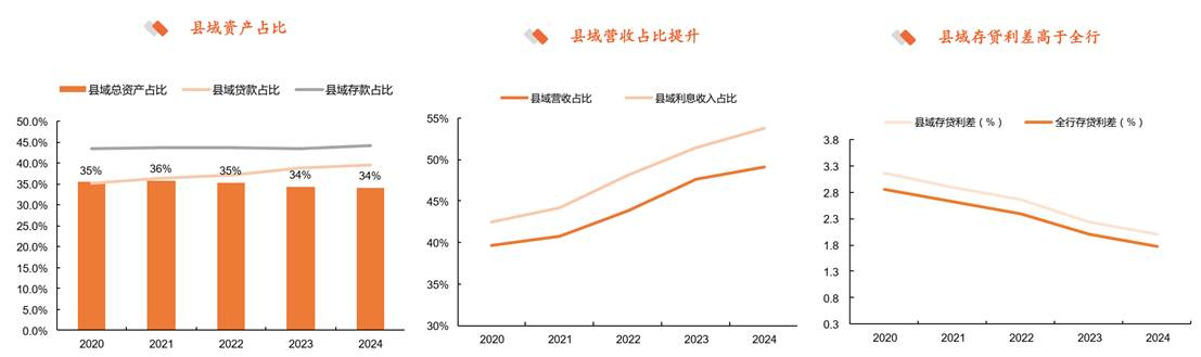 【公司战略:农行县域特色优势凸显】农行始终坚持“服务乡村振兴领军银行”和“服务实体经济主力银行”两大定位,做优做强服务“三农”主责主业。Ø 农行不断坚持向县域农村倾斜金融资源,县域营收贡献不断提升。此外,在24年战略表述中,新增对于高质量发展、重大战略、重点领域、薄弱环节的表述,并突出了对于五篇大文章的重视。