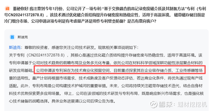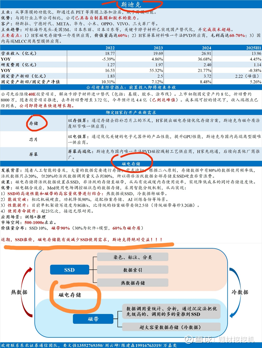 斯迪克在磁电存储领域的核心竞争力源于其独家技术储备:作为国内唯一掌握纳米级涂布工艺的企业,该技术在磁电存储产品中价值量占比超 60%,且在相当长周期内有望维持独供地位。