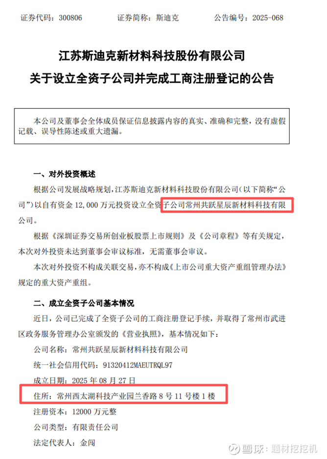 该子公司注册资本 1.2 亿,是目前斯迪克全资持股认缴出资额第三大的子公司,也是 “非斯迪克” 名称系列注册资本第一大的控股子公司,体现出斯迪克对该业务的高度重视。值得注意的是,其注册地常州西太湖科技产业园内有哈勃投资(华为系)参股的常州富烯科技股份有限公司,且两家公司注册地址相同。以往斯迪克子公司注册地集中在苏州太仓和宿迁泗洪,此次在常州产业园的布局,被视为与华为在磁电存储千亿赛道合作的第一步实质性进展,关注后续华为入股新公司的可能性及合作深化空间。