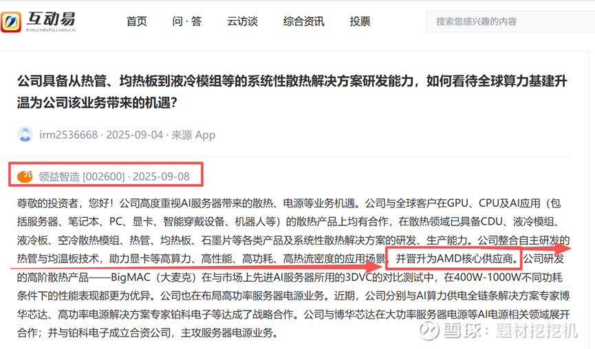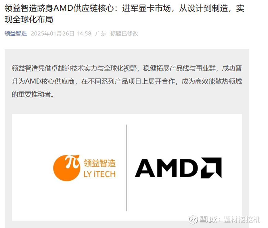 合作资质与全球化布局:凭借技术实力与全球化视野,在 AMD 不同系列产品项目上展开合作,整合自主研发的热管与均热板技术,以精密散热设计助力显卡稳定高效运行,相关合作细节可参考公司 2025 年 1 月 26 日公众号文章《领益智造跻身 AMD 供应链核心:进军显卡市场,从设计到制造,实现全球化布局》。