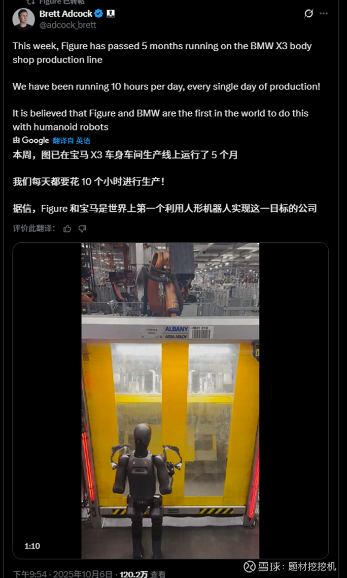 此前 10 月 6 日,Figure 创始人透露,其人形机器人已在宝马 X3 车身车间生产线稳定运行 5 个月,每日持续作业 10 小时,承担钣金搬运与精准装配任务,Figure 与宝马成为全球首个实现人形机器人生产线常态化应用的企业组合。