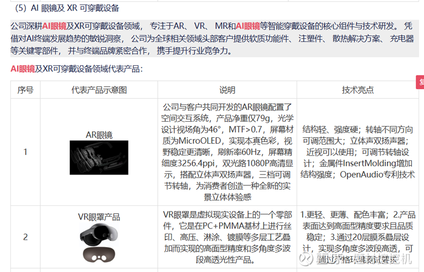 深度绑定头部客户:是 Meta Ray-Ban Display 智能眼镜的核心供应商,供应镜腿镜框结构件(需集成电子器件,兼顾佩戴舒适与使用寿命)、散热解决方案等关键部件;同时覆盖苹果、陆逊梯卡(雷朋、Oakley)、XREAL、Rokid、雷鸟、亮亮视野等全球顶级智能眼镜品牌,客户阵容豪华。
