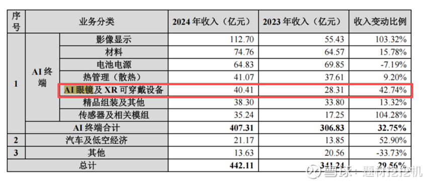 技术积累支撑:在热管理、材料工艺(金属加工、注塑、CNC 等)、结构设计等领域积累深厚,能根据客户差异化需求提供定制化组件方案,适配 OpenAI 与 Jony Ive 合作的 “设备家族” 创新方向;同时布局传感器及相关模组业务,2024 年收入达 35.24 亿元,较 2023 年同比增长 104.28%,为 AI 消费电子提供多维度组件支持。