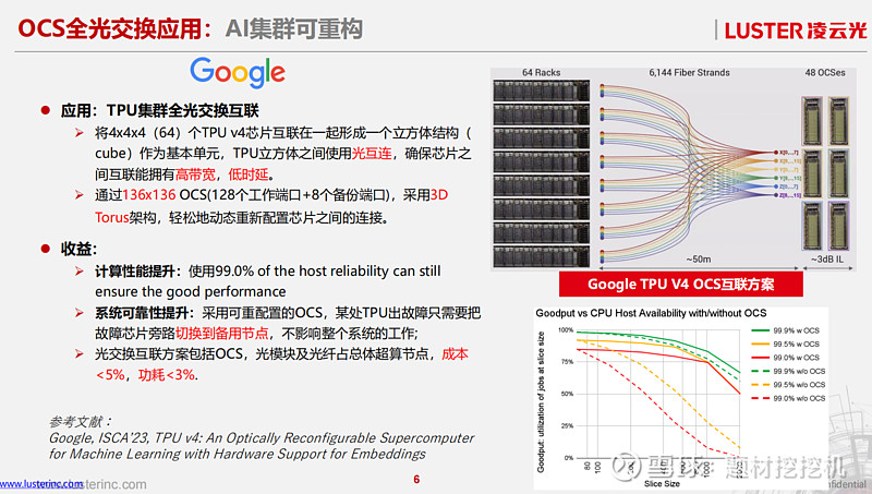 ChatGPT 引爆 AI/ML 需求后,大模型参数规模每年约 10 倍增长,AI/ML 集群从千卡向万卡、十万卡扩展,互联距离也从数十米延伸至上百米,传统电交换在带宽、功耗、时延上的瓶颈愈发凸显。而 OCS 光路交换机无需光电转换,在速率、功耗、时延上远超光 - 电交换,谷歌 TPUv4 集群采用 OCS 互联方案后,不仅实现计算性能与系统可靠性提升,光交换方案的成本与功耗占比还分别低于 5%、3%,成为 AI 集群互联的核心技术选择。