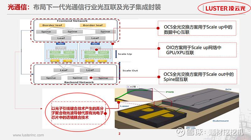 谷歌以 OCS 全光交换为核心构建 TPU 集群互联体系,成为全球 OCS 技术应用的引领者,而凌云光围绕 AI 驱动的大规模算力基础设施建设需求,精准布局了 OCS 全光交换、光 IO 解决方案等下一代光通信产品,与谷歌推动的 OCS 技术路线高度契合。其中,OCS 全光交换方案可分别应用于 Scale up 中的数据中心互联、Scale out 中的 Spine 层互联,与谷歌 TPU 集群的 OCS 应用场景完全匹配,直接顺应了谷歌引领的 OCS 技术落地方向。