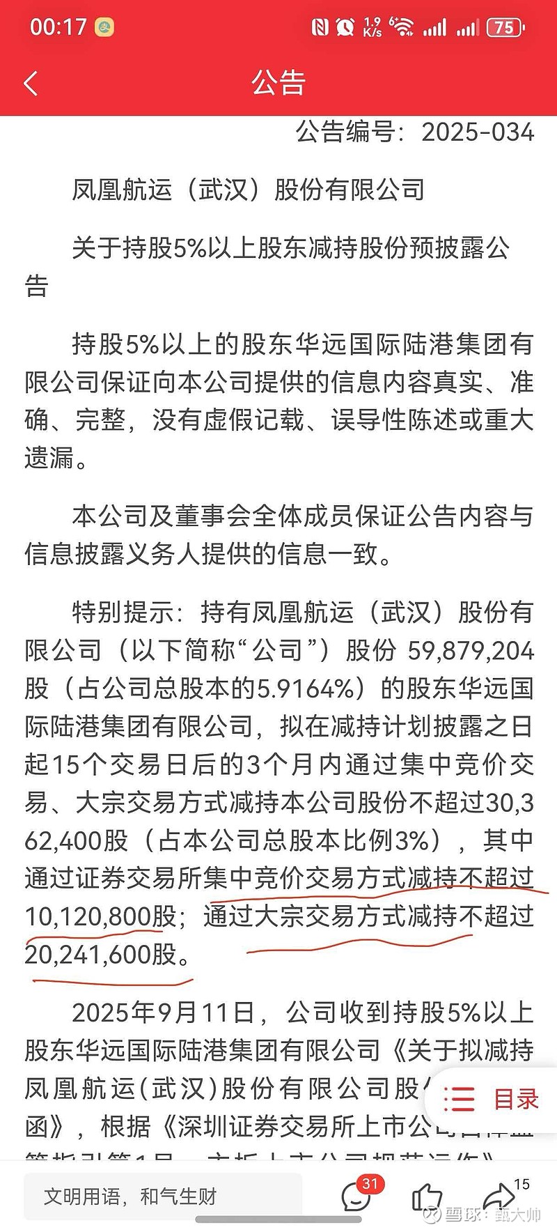 今年9.12公布减持计划,26年1月12到期,所以开始减,集中竞价交易部分最多1kw股,基本减完了,剩下的2000w股要减的话得大宗,不用太担心。这家伙要重组的话,目前来看得等这三股东的5%后面全减持完估计才有动作$凤凰航运(SZ000520)$