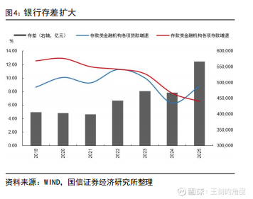 面对新旧动力转换的衔接缺口,财政投放成为稳增长与促改革的关键支撑,货币创造演变为“信贷减弱、财政增强”的新格局,财政投放对M2增量的贡献占比持续攀升,2024-2025年财政净投放对M2增量贡献分别为49%和45%。财政赤字投放的增加与信贷需求的回落,共同推动银行资产配置结构重构,政府债券成为银行重要配置资产,最终导致银行业存差呈现趋势性上升。2020年存款类金融机构存差已接近58万亿元,2019年的时候差不多约40万亿元。