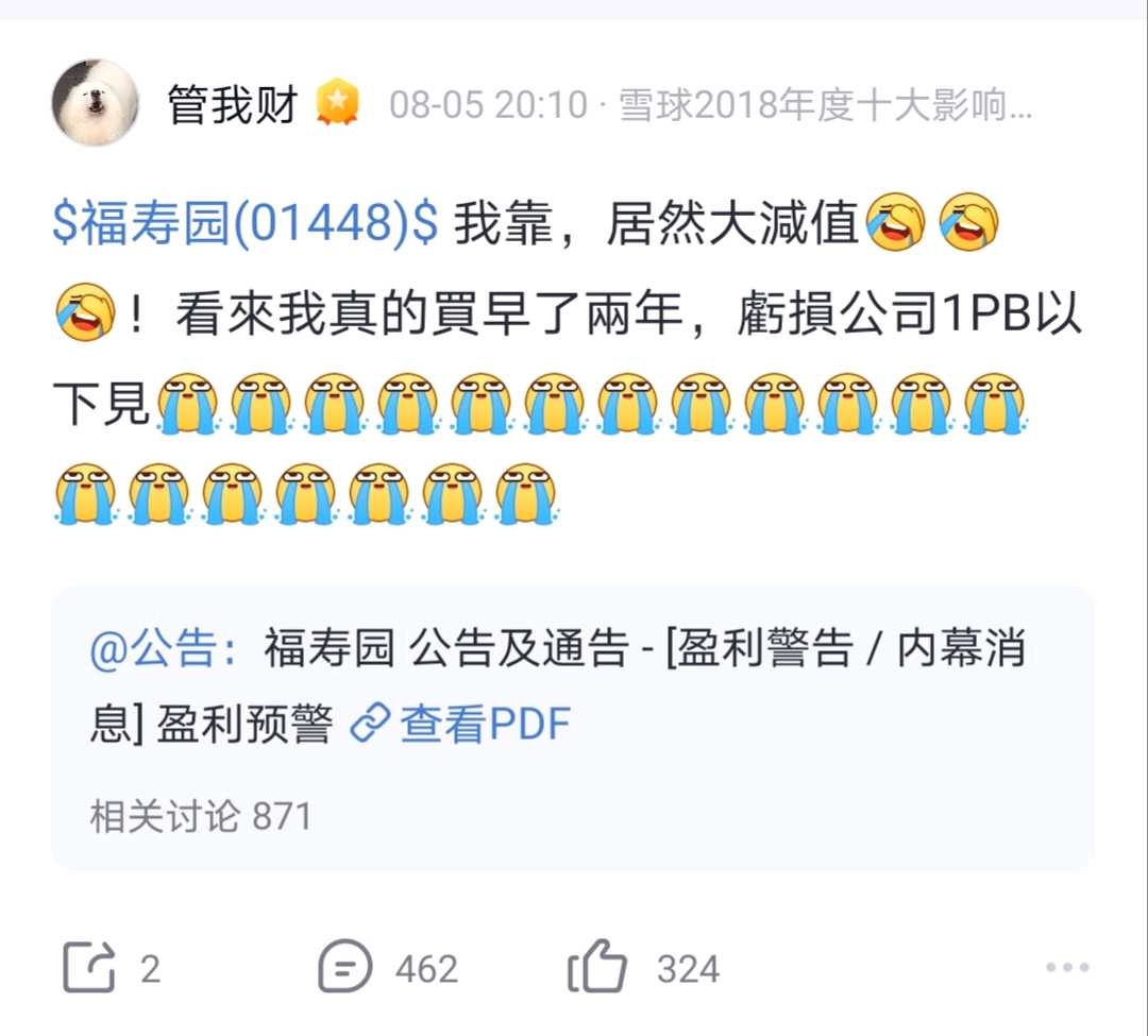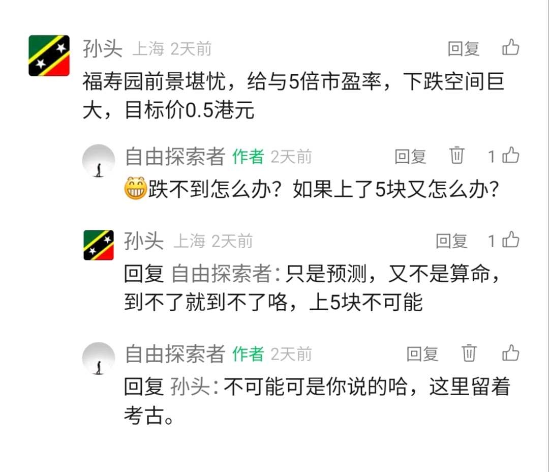 话说回来加仓的福寿园,我看见很多人都在评论,说它是亏损股,必须跌破净资产。还有更极端的,说它要跌到0.5港币。