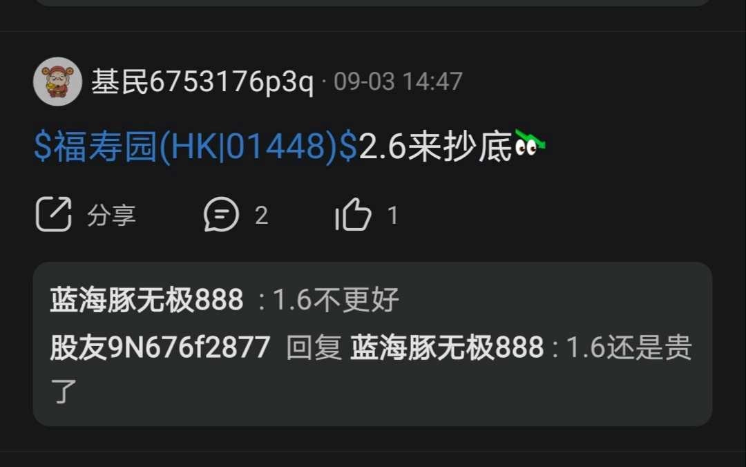 首先,这些人这么极端,我也不知道是真傻还是假傻,特别是说福寿园要跌到0.5港币的那位,要知道2024年福寿园一年的分红就已经达到了0.547港币了,如果股价跌到0.5港币,那么分红后股价就会变成负数了,那么任何人都能不费吹灰之力就把整个公司买下来,等于是有人把几十亿送给你,你觉得这是有可能的事吗?