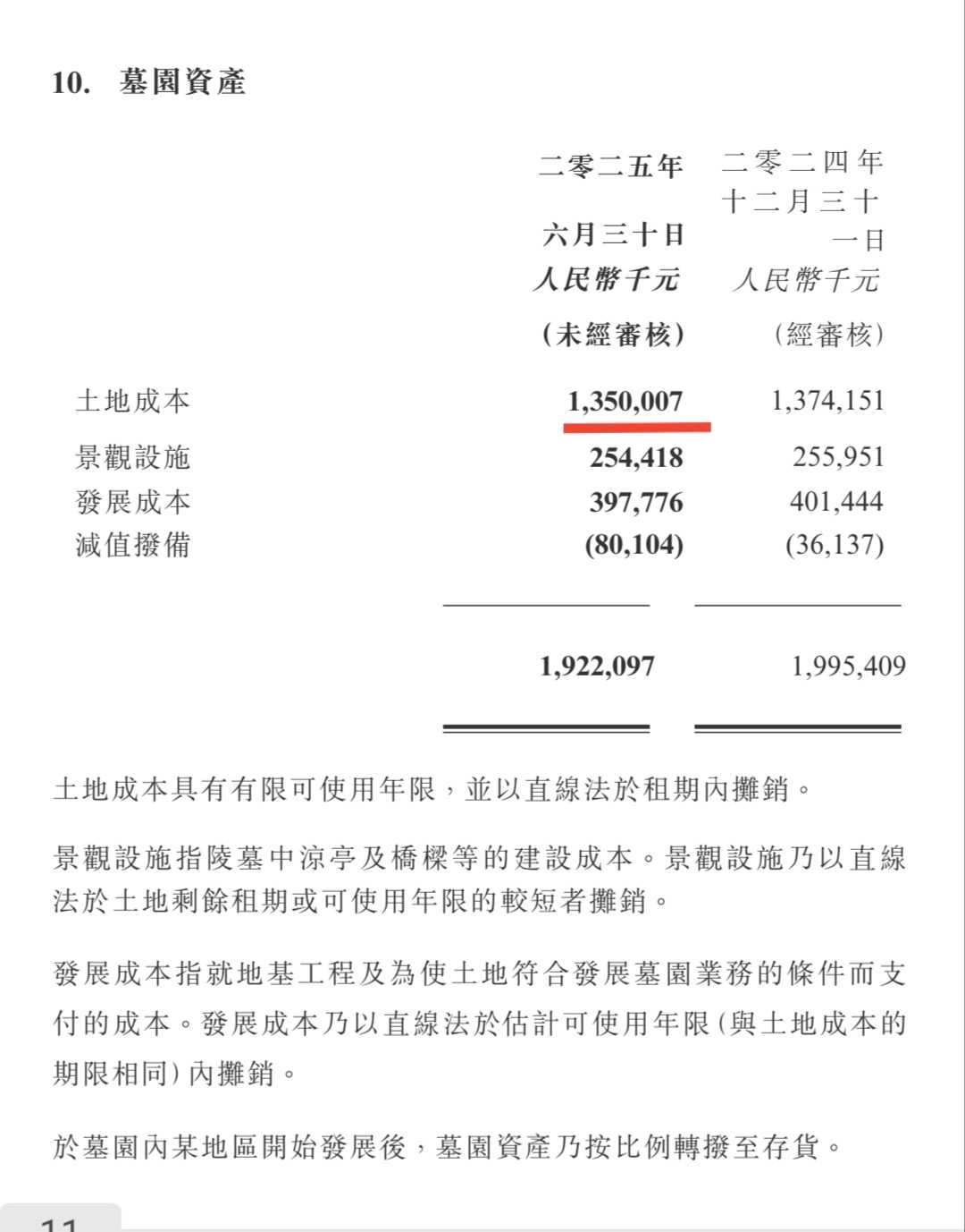 但这些在福寿园的资产中只是小意思,真正被远远低估的,是资产负债表中的墓园资产,还有存货。墓园资产只有19.22亿,其中土地成本只有13.5亿。这些墓园的土地,都是以当年拿地成本入账的,入账的土地成本非常非常低,举个例子,福寿园售价最高的上海福寿园的土地,因为拿地时间最早,所以入账成本最低,只按每平方500元左右入账。而上海福寿园的售价,2024年之前都是10万一平方以上,今年被限价了,但每平方售价也在6万元以上。