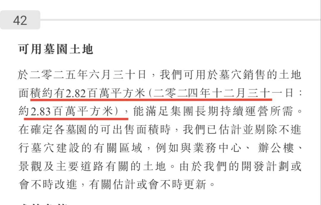 我们看看福寿园2024年的一张成本统计表,2024之后福寿园没有进行任何收购,所以2025年土地成本也是一样的。我们看到福寿园在墓园资产加上存货的土地成本,实际上只有497元一平方。加上开发成本和景观设施成本,合计908元一平方。而在2025年上半年,福寿园经营性墓园销售额是3.96亿人民币,财报上说福寿园的土地储备,从2024年底的283万平方米减少到2025年上半年底的282万平方米,约减少1万平米。也就是说卖了1万平方米的墓穴,售价3.96亿,平均每平方售价大约3.96万。而这些墓园土地,在资产负债表是以908元/平方米入账的。所以说,福寿园的资产是被严重低估的。我认为这些墓园土地储备,在今天起码应该值1万元一平方米,282万平方,实际价值大约282亿人民币。就算给个折现,打个五折,最起码也值140亿人民币。