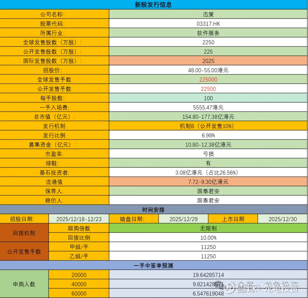 迅策全球发售2250万股,每手股数100股,招股价48-55港元,入场费5555.47港元,发行比例6.98%,募集资金10.80-12.38亿港元,甲乙组各11250手,孖展倍数3.85倍,人少货多,中签相对容易。