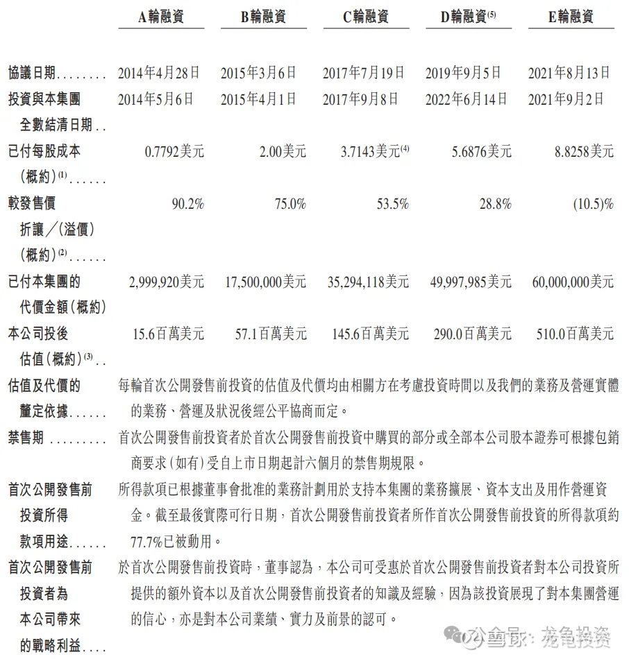 IPO前公司总共完成5轮融资,E轮融资完成后,公司估值5.1亿美元,约合39.81亿港元;每股成本8.8258美元,约合68.89港元,较发售价溢价10.5%;禁售期6个月。值得一提的是IPO前E轮融资是腾讯投的6000万美金。