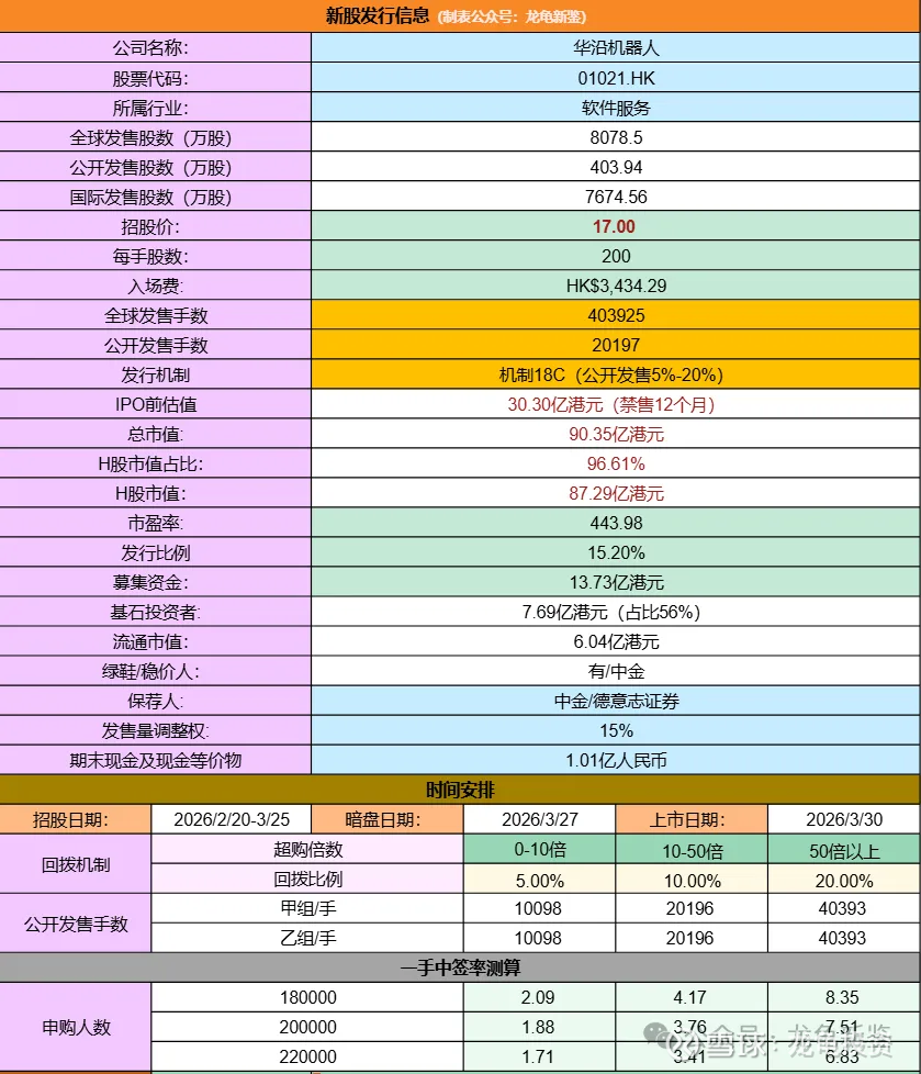 华沿全球发售股数8078.5万股,每手股数200股,招股价17.00港元,入场费3434.29港元,采用机制18C发行,首日孖展倍数34.93倍,回拨20%后公开发售手数80786手,预计18-22万人参与,一手中签率5%左右,申购500手稳一手。