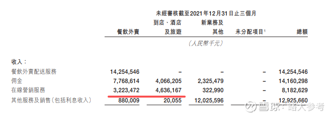 以美团还单独披露外卖和到店业务数据的2021年四季度为例,在外卖贡献了最多的收入和GMV的情况下,美团到店(包括酒店和旅游)的营销服务收入竟然比餐饮外卖还多了50%左右。