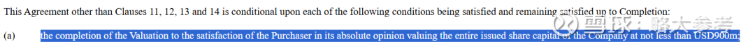 第一处“潦草”就是公告中的9亿美元底价。公告在条件一栏明确地提到了“not less than USD900m”,整句话翻译过来就是“估值工作完成,且该估值令买方绝对满意;该估值对公司全部已发行股本的估值不低于9亿美元”。买方ANPA明确地要求了9亿美元的底价。