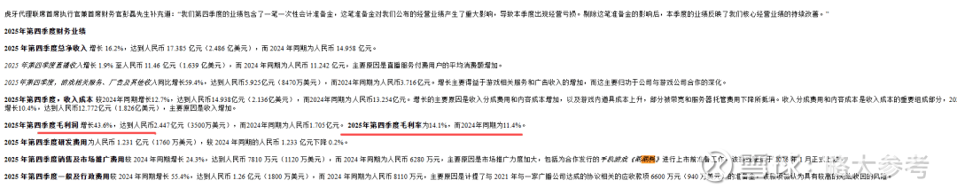 其实虎牙四季度的毛利润同比增长了43.6%,毛利率也提升了接近3个百分点,如果把这1.4亿元的损失提前或者延后,虎牙四季度是有可能实现盈亏平衡的。