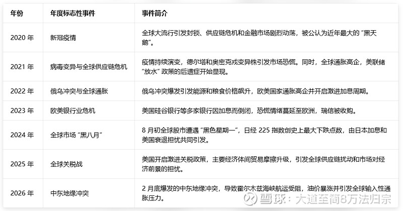 我简单的做了一个梳理,几乎每年都会出现一个标志性的“黑天鹅”或重大冲击事件。下表是我梳理了2020年以来的极端事件: