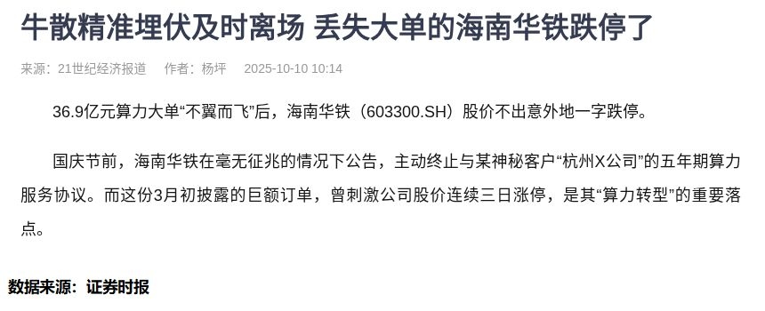 国庆节前最后一个交易日,海南华铁的22万股东集体体验了一把"高空跳水"。那个曾经让股价三连板的36.9亿元算力大单,突然变成了"零交付、零成本、零履行"的三无产品。更魔幻的是,号称要支付20%违约金的合作方"杭州X公司",至今连个正经工商登记都查不到。