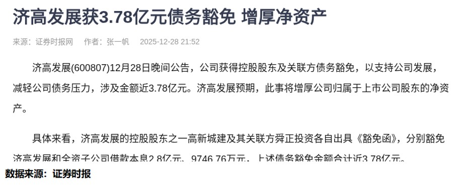 12月28号晚上,济高发展发了条公告——控股股东高新城建和关联方舜正投资,直接给它免了近3.78亿的债务。这事儿让不少人讨论:毕竟能直接增厚净资产,对本来盈利能力偏弱、净资产才四千多万的济高发展来说,算是控股股东给的“实在支持”。但对咱们普通投资者来说,光看这消息没用,更该问的是:这“支持”能不能转化成股价的动力?关键得看机构大资金愿不愿意真的“盯着它折腾”。