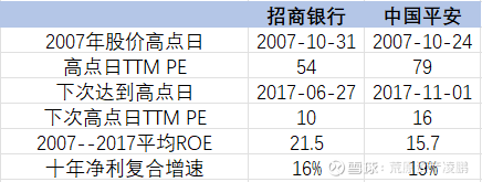 如上表所示:招行和平安分别于2007年10月31日和2007年10月24日达到股价高点,此后一年最大下跌了76%和86%;经过了十年,分别于2017年6月27日和2017年11月1日创出新高。