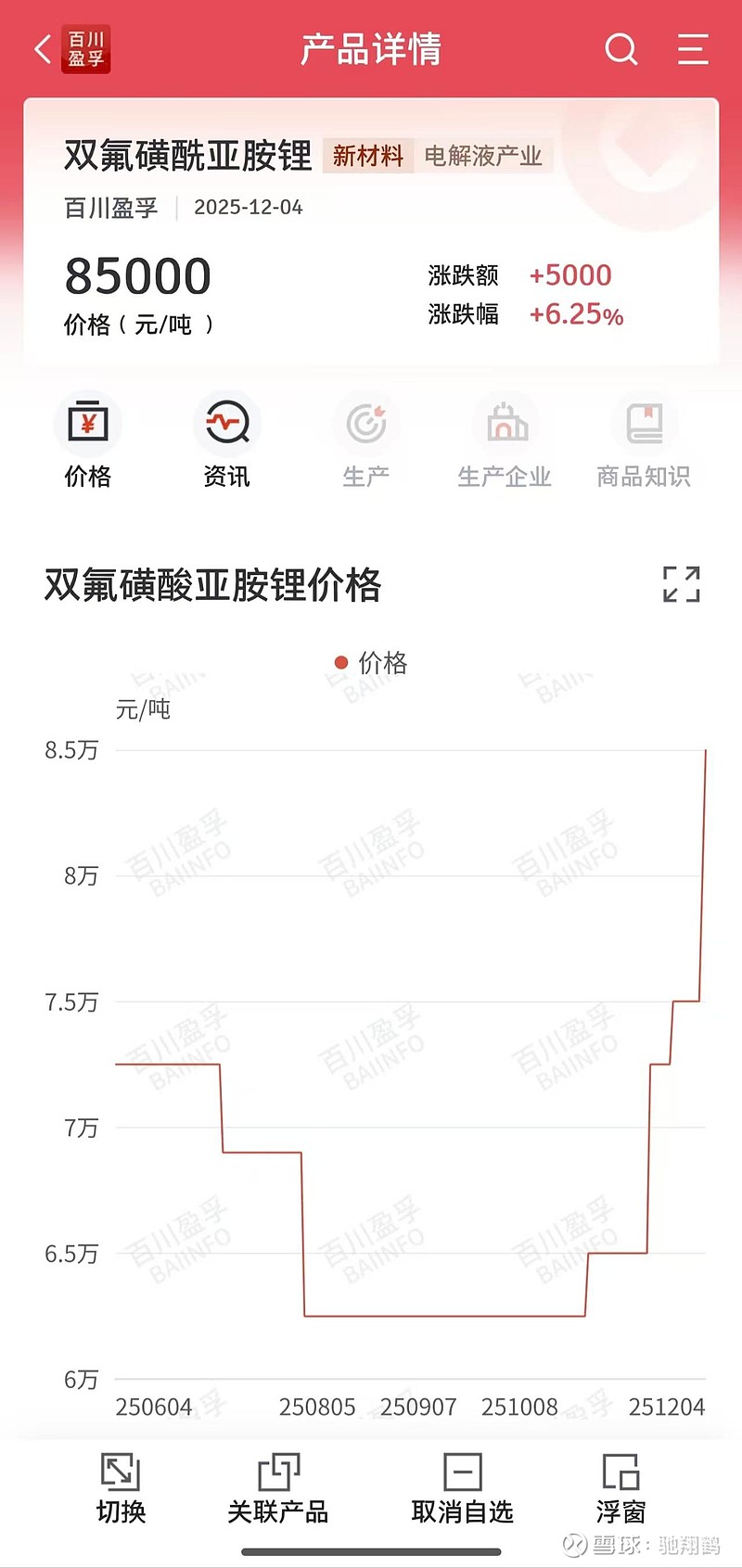 $永太科技(SZ002326)$ $多氟多(SZ002407)$ $天赐材料(SZ002709)$ 双氟磺酰亚胺锂加速上涨!两天上涨一万!据百川盈孚资讯,双氟磺酰亚胺锂近期加速上涨,12月3日报价80000,较前日上涨5000元,12月4日报价85000,继续上涨5000元,两日累计上涨10000元!