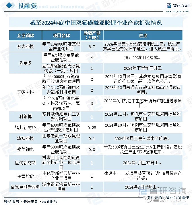 上市公司中,永太科技的双氟磺酰亚胺锂(LiFSI)已投产67000吨/年的产能,当前产能利用率正在稳步提升。在工艺优化和降本措施的推动下,双氟生产成本有所下降,竞争力进一步增强。多氟多规划双氟磺酰亚胺锂4万吨产能,预计25年年底建成。天赐材料年产40000吨双氟磺酰亚胺锂改扩建项目已信息公示。