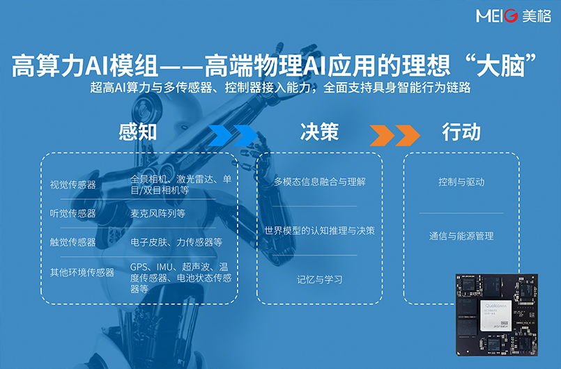 物理AI的实现要求终端产品具备多模态的物理感知与自主决策能力,这不仅对产品搭载的模型算法的能力提出较高要求,也对其计算核心的算力与多传感器、控制器接入能力提出了较高的要求。美格智能作为全球领先的高算力AI模组与智能模组提供商,公司对物理AI的支撑,始于核心硬件,但远不止于此。公司始终致力于提供一套完整的“能力组合”,让合作伙伴能够快速、高效地开发出适应不同场景的物理AI产品。