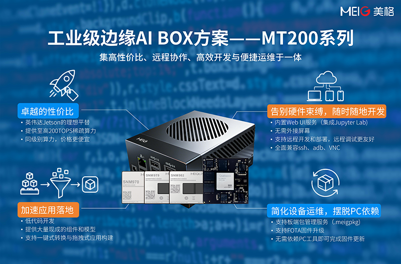 美格智能深知,硬件只是载体,对前沿AI模型的深度适配与优化才是释放潜能的关键。而MT200 AI BOX开发平台,则像一个“万能钥匙”,为开发者打开了快速验证物理AI算法与应用的通道。