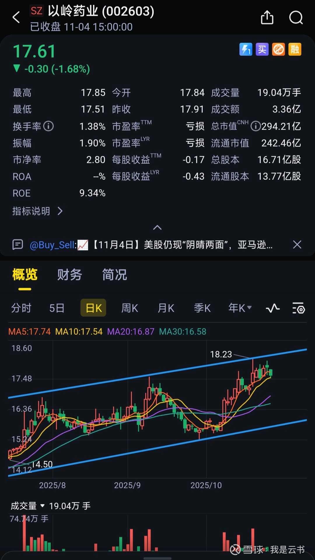 在10.16日《短调结束,重拾升势,以岭药业突破前高在即!》这篇里预判了以岭药业很快会创反弹新高,10月22日,以岭药业股价如期创下17.78元的反弹新高,达到了我预设的初步目标。鉴于当时股价已接近短期上升通道的上轨,我选择了落袋为安。随后股价虽如预期回调,但幅度远小于想象——仅调整了三个交易日,在10月27日超预期的三季报公布后,股价在10日均线便获得强力支撑,重拾升势,并在10.28日触及18.23元的通道上轨。