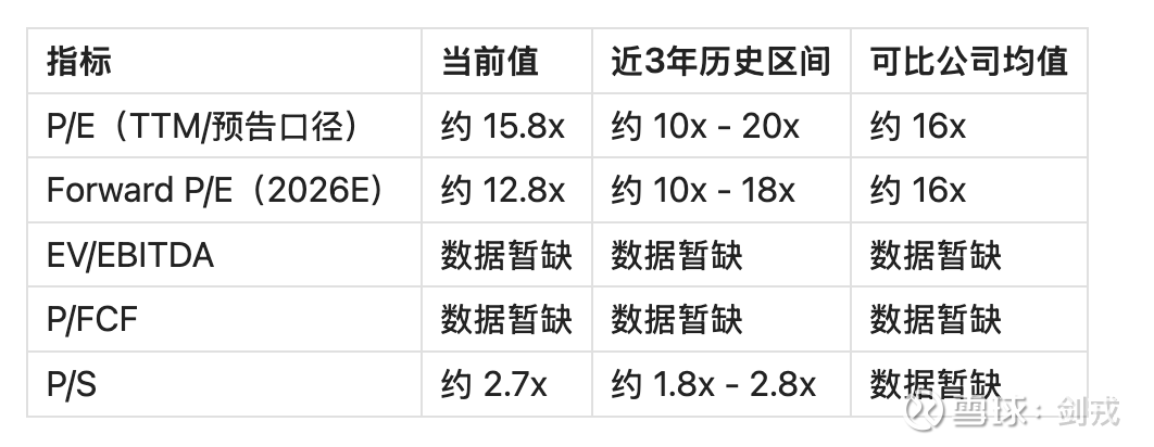EV/EBITDA、P/FCF 的公开 A 股口径分散,以下若未能稳定验证则标注为 数据暂缺。