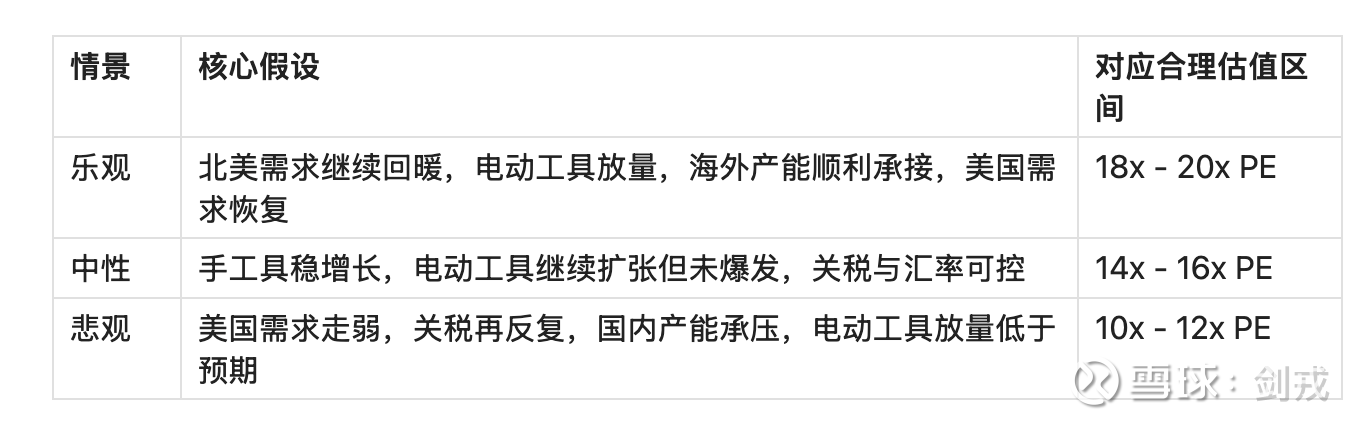 市场愿意为它的全球化产能和电动工具第二曲线付一些溢价,但不会给到创科实业那种更高估值。