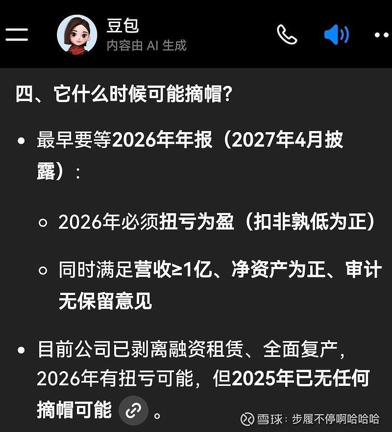 2025年报应该还是亏损,问了一下豆包千问,今年有没有摘帽可能,给出答案左右摇摆。还都是言出有据。到底年报盈利是不是必要条件?